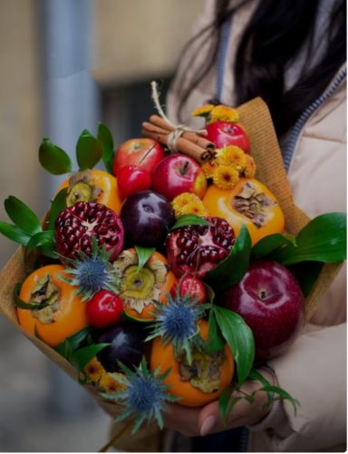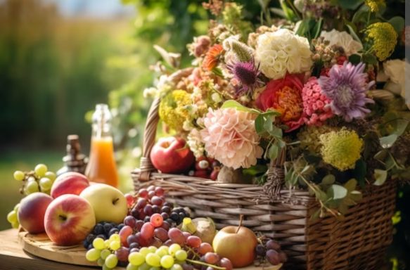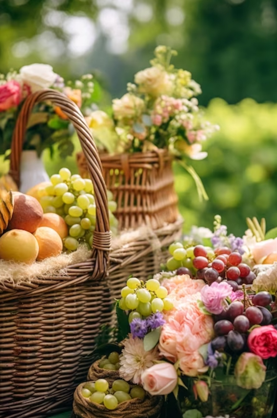 Fleur et Chuchotement vous offre la possibilité de commander des paniers remplis de délices sains tels que des fruits, des légumes, accompagnés d'une combinaison florale fraîche ou artificielle.